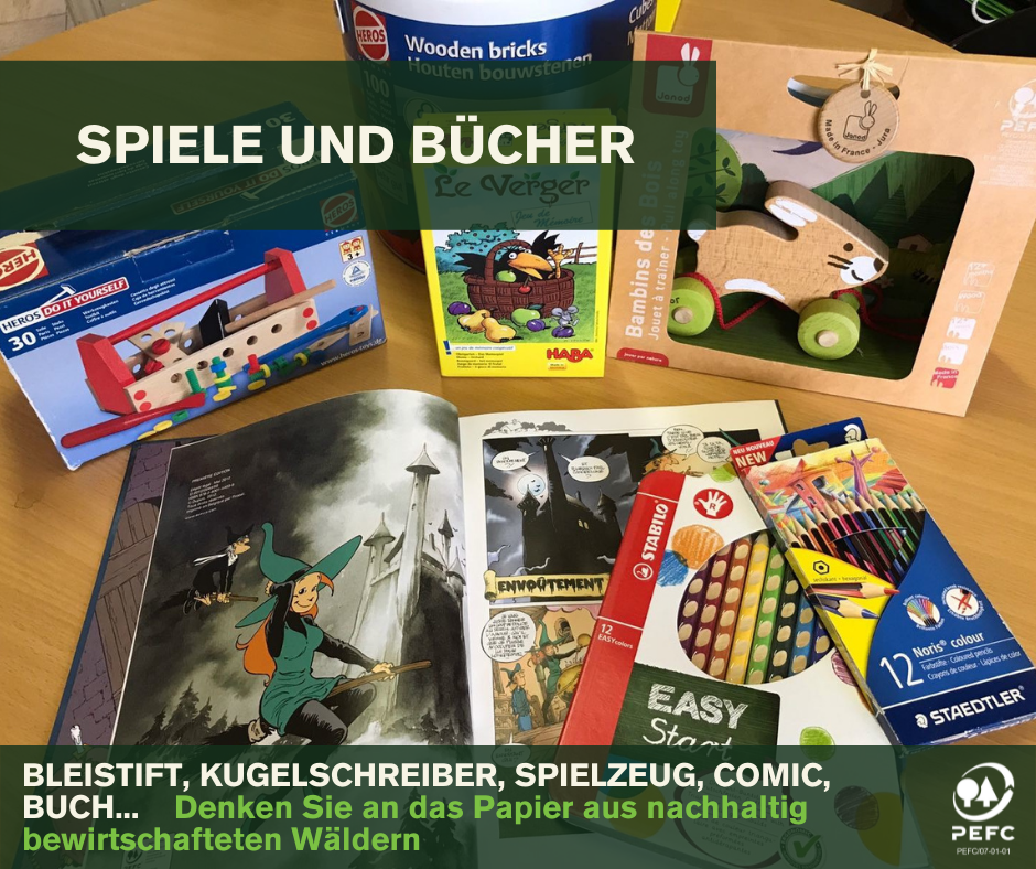 Beispielbilder von Kaufartikeln aus Holz und Papier.
